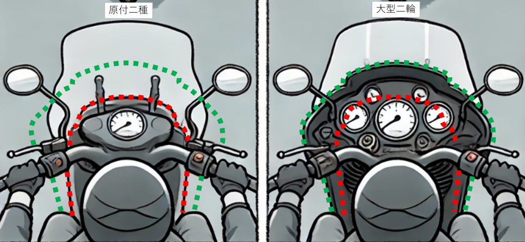 大型二輪ATで感じた違和感は、カウルによる視野制約のほか、腕が少し伸びていたかもと。